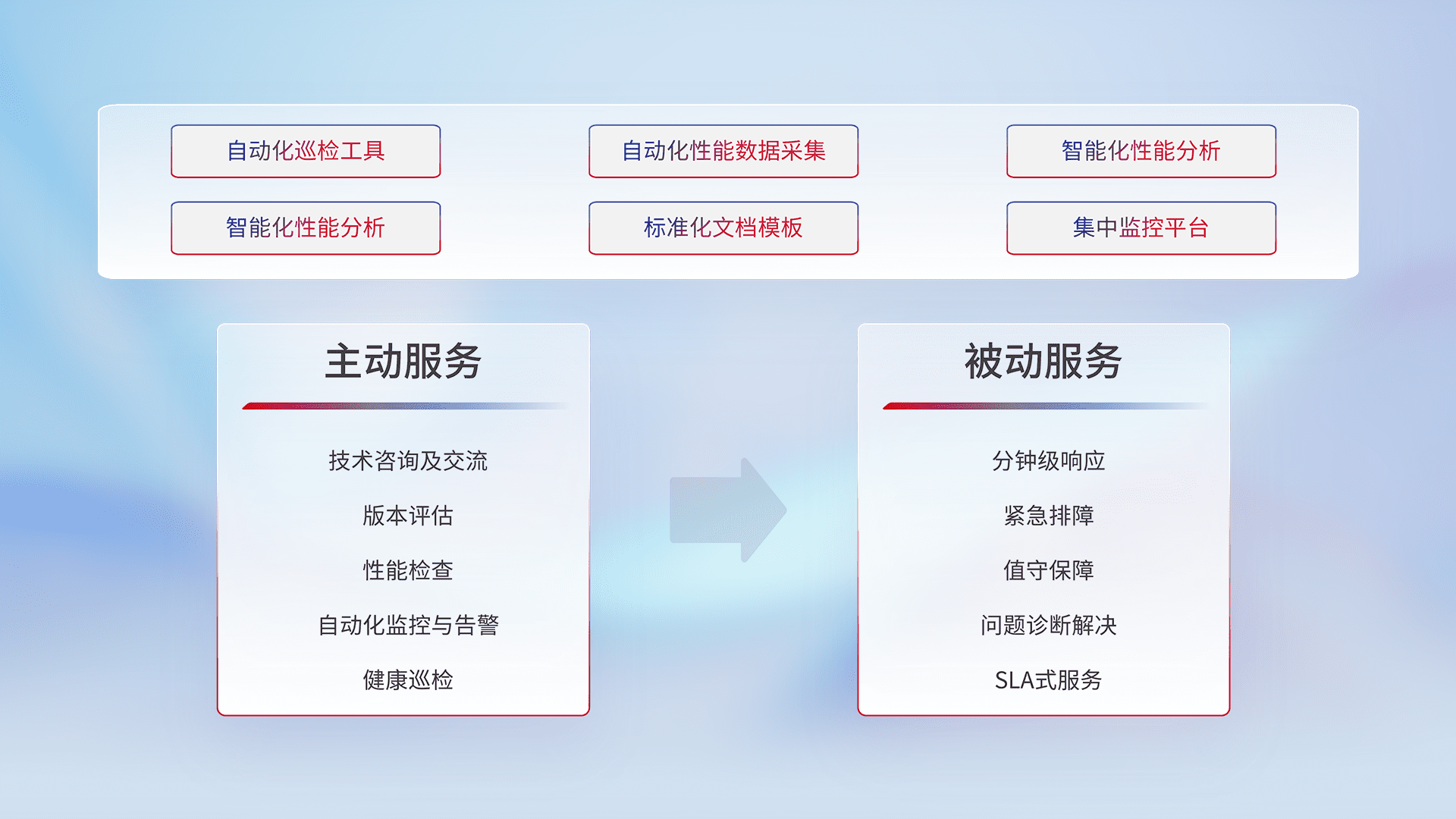 智能化工具和标准化文档,,保障服务质量,,,提供主动服务(包含技术咨询、、、、版本评估、、、、性能检查、、自动化监控与告警、、、健康巡检)和被动服务包含(分钟级响应、、紧急排障、、、值守保障、、、问题诊断解决、、、、SLA服务)。。。