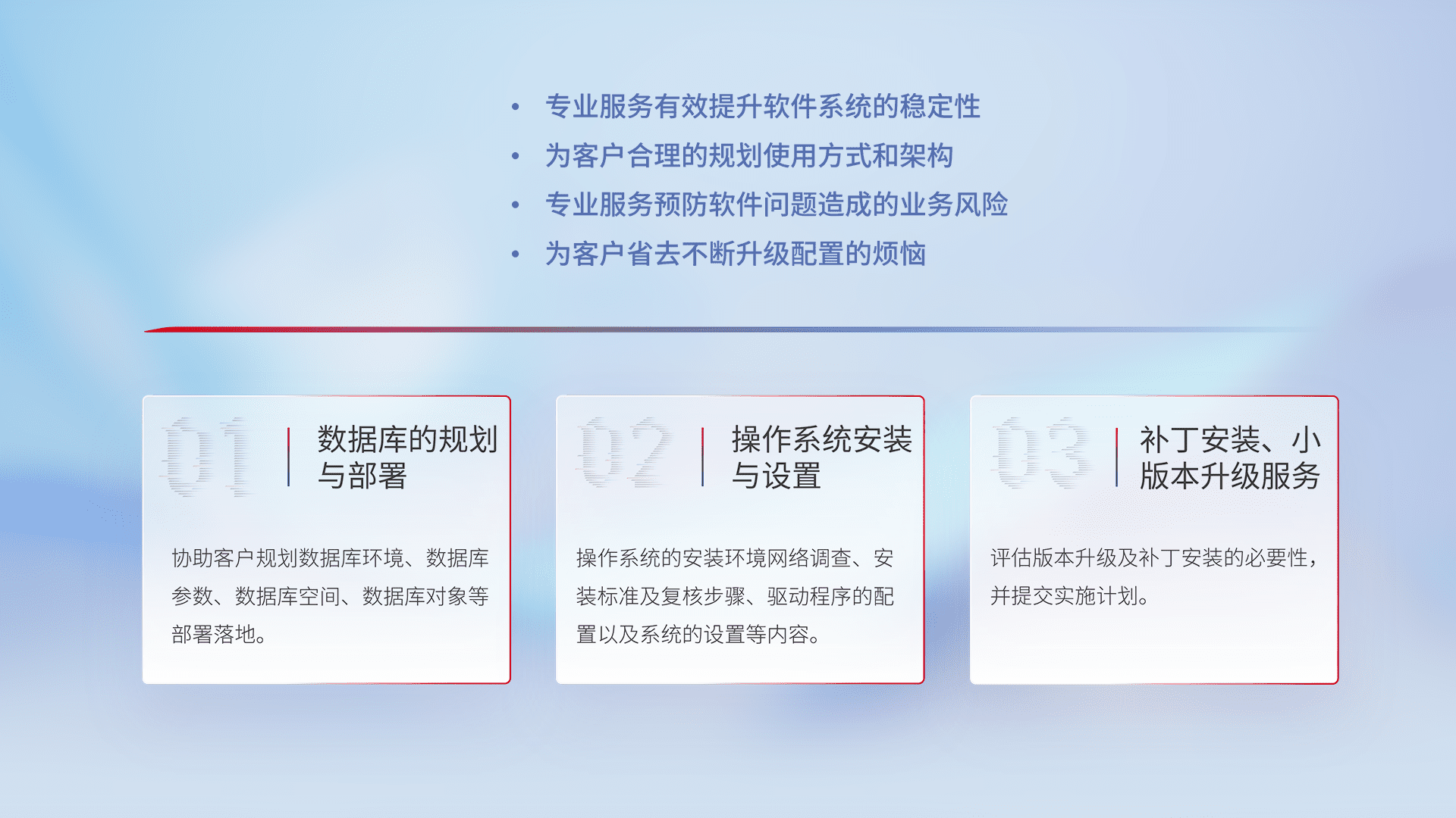 为客户提供软件规模升级、、快速部署、、、、按需配置的专业服务,,,从数据库的规划与部署到操作系统的安装与设置,,再到补丁安装和小版本升级提供支持。。