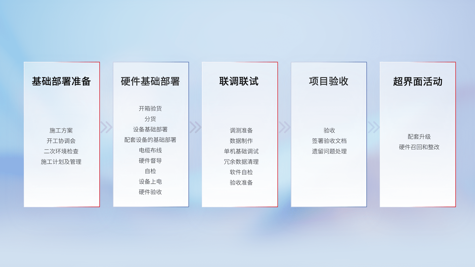 从基础部署准备、、、、硬件基础部署、、、联调联试、、项目验收、、、、越界面活动的全过程可追溯,,,,保证施工质量和进度。。。。